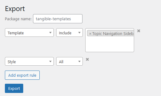 The export functionality provides a selection interface so you can collect any of the templates on your site into an export package. If you don't provide an alternative package name, the package will be exported with the name tangible-templates-yyyymmdd.json with the current date appended to the filename.