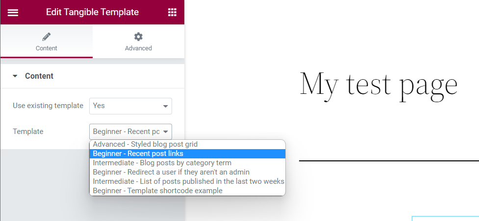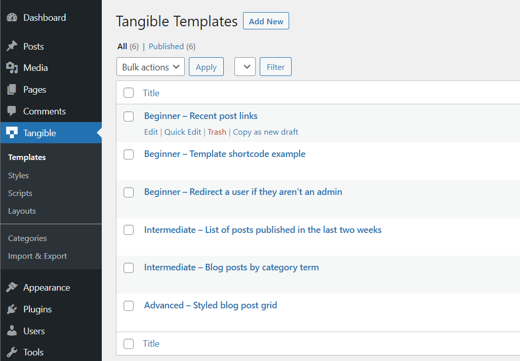 You'll now have a handful of templates visible under Tangible > Templates. To view any of them, click on the post title. We recommend starting with the template called "Beginner - Recent post links."