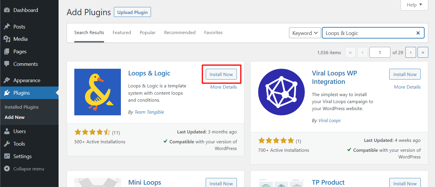 In the admin dashboard of your WordPress site, navigate to Plugins > Add New, search for Loops & Logic, and click Install Now. Once it's finished installing, click Activate.